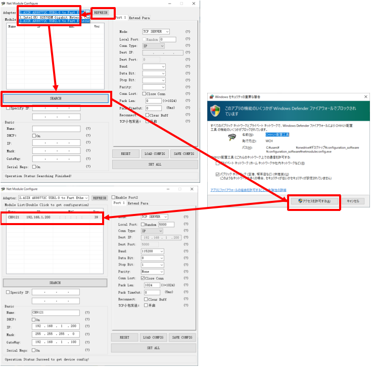 アプリケーション起動後は下図手順により、pico-ETH-CH9121を認識させます。