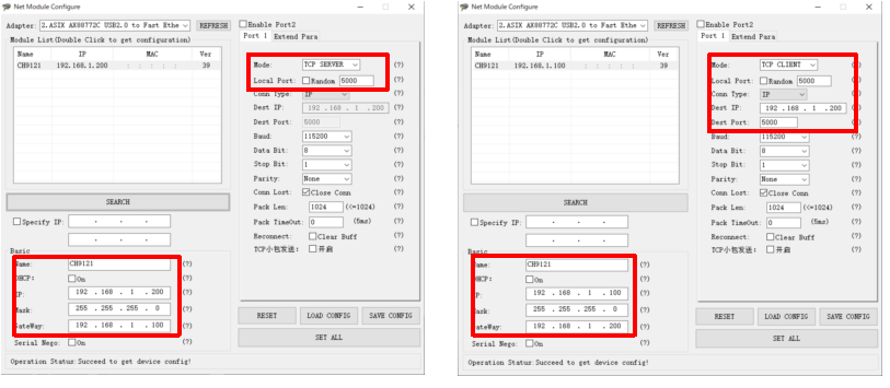 pico-ETH-CH9121をTCP Serverにする設定により、1セットはTCP Server、1セットはTCP Clientにします。