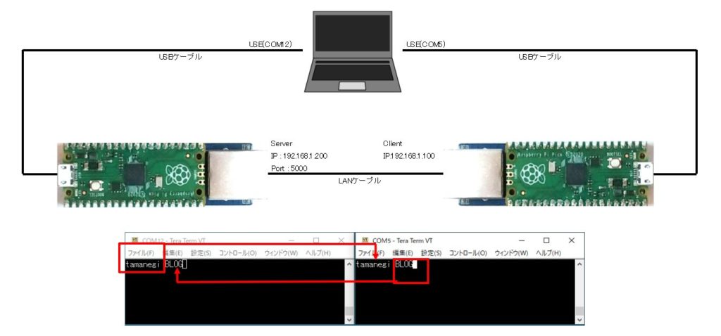 Raspberry Pi Picoに書き込むスケッチは2セットともに同じ「パソコンとTCP Serverの通信」で使用したスケッチを使用します。