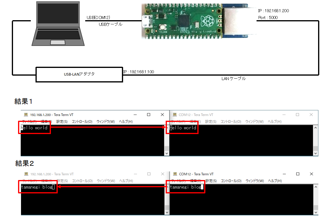 結果2ではTeraterm右(USBシリアル)から送信した文字列をTeraterm左(USB-LANアダプタ)が受信した結果です。