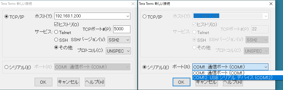 | TCP Serverにする設定 | TCP Clientにする設定 | |