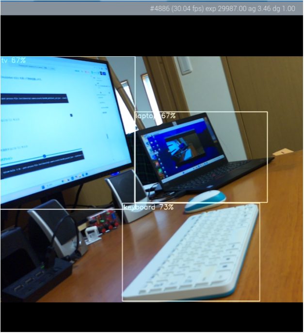 作業机を撮影したところ、PCモニタ(TV)、パソコン(laptop)、キーボード(keyboard)を認識しました。