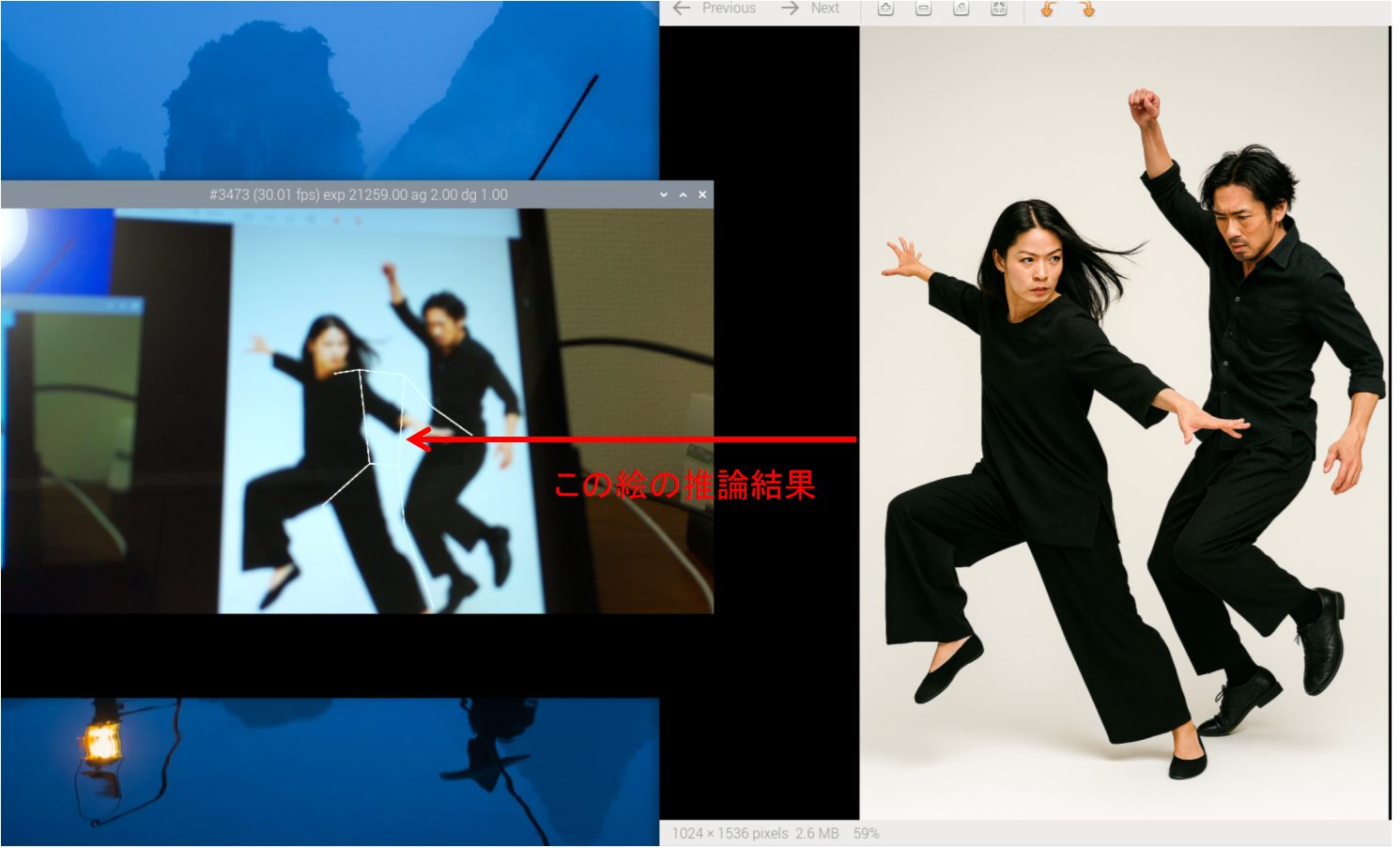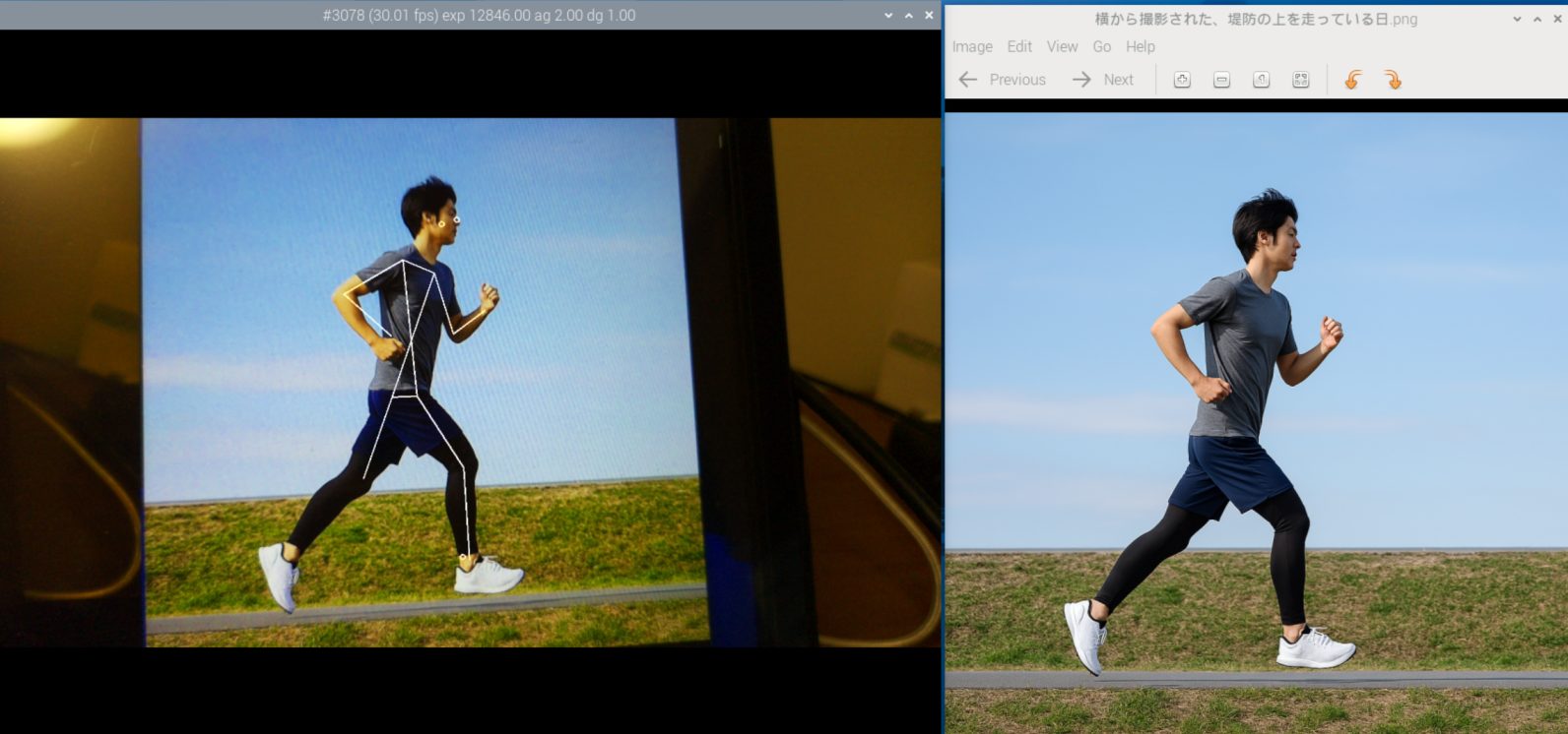 左側の画像はAIカメラが骨格推定を加えた画像です。