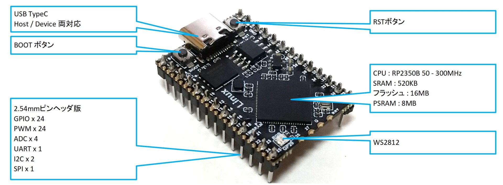 使えるピン数は載せる基板次第なのでRP2350Aよりは基板は幅広な基板になります。