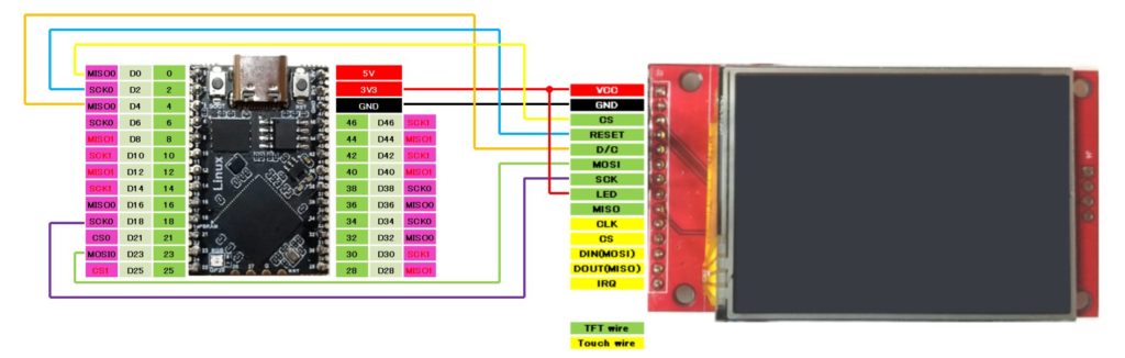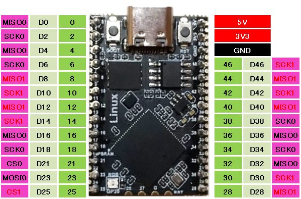 SPIで使用するMOSIとMISOとSCKは決められたピンの範囲内で任意のピンに設定できますが、TinyRP2350Bの2.54ピッチスルーホールにはSPI1のMOSIが引き出されていないため、実質SPI0の1ポートのみ使うことができます。